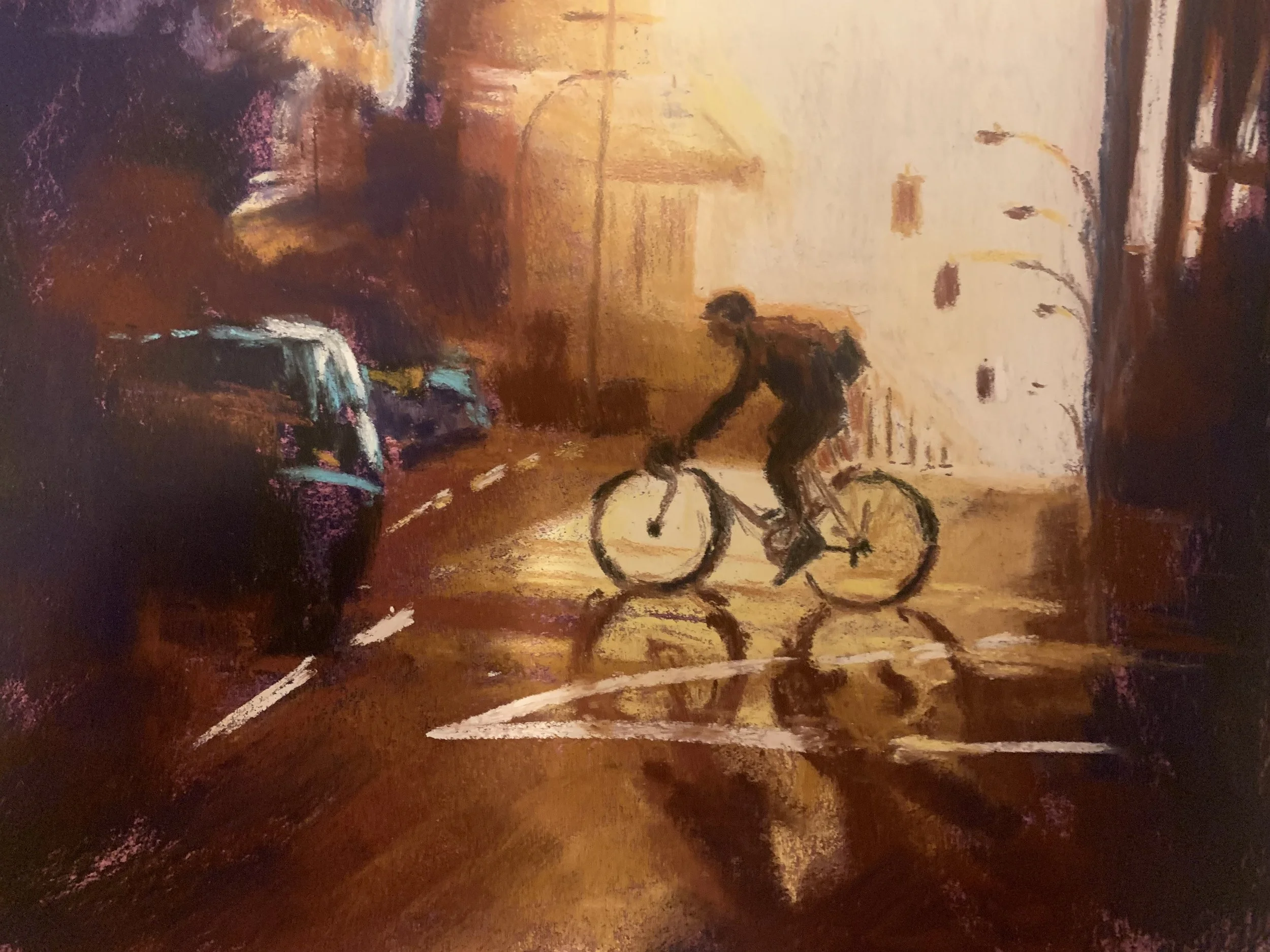 Born and raised in NYC, I’ve always love the sound of the traffic and the vibrant lights, and the bustle of humanity on the streets…..24/7!!! That’s what makes some people nuts, but I remember going to sleep with the sound of the cars outside my bedroom window on 50th street and 1st Ave. in Manhattan when I was 5 years old! It doesn’t matter what time of day or night, there is ALWAYS something to do, something to see. It’s a dance of light and sound and movement. How can I capture that in a snapshot of time, that once I’ve put it down with my pastels, is still forever. I keep trying though.